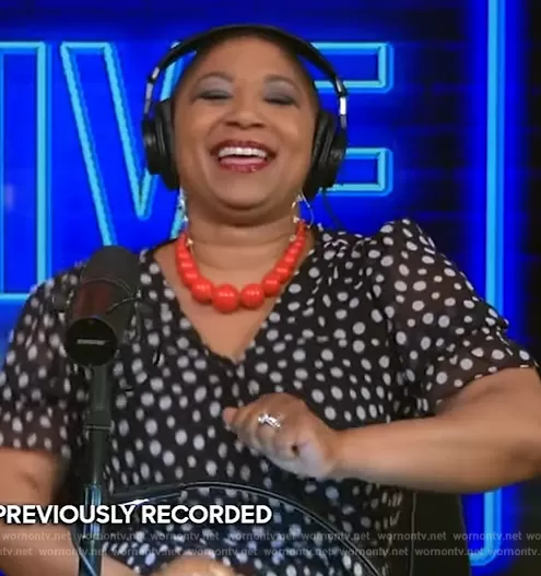 Deja Vu on Live with Kelly and Mark on Disney ABC Home Entertainment was spotted wearing this black polka dot print dress on Live with Kelly and Mark on Apr 20 2023's episode. Deja Vu's Dress is the Chiffon Print Dress with Puff Sleeves by Calvin Klein.