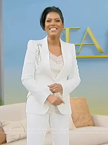 Tamron Hall on Tamron Hall Show on ABC was spotted wearing this white embellished blazer on Tamron Hall Show on Apr 20 2023's episode. Tamron's Blazer is the Embellished Peaked Single-Button Blazer by Alexander McQueen.