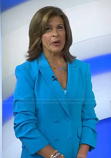 Hoda Kotb on Today on NBC was spotted wearing this blue ruched sleeve blazer and cowl neck cami on Today on Aug 24 2023's episode. Hoda's Camisole is the Marta Cami in Atomic Blue by Cinq a Sept . Hoda's Jacket is the Kris Blazer in Atomic Blue by Cinq a Sept . Hoda's Pants is the Billie Pants in Atomic Blue by Cinq a Sept.
