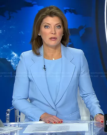 Norah O'Donnell on CBS Evening News on CBS was spotted wearing this light blue blazer on CBS Evening News on Sep 19 2023's episode. Norah's Jacket is the One-Button Wool & Silk Blazer by Lafayette 148 New York.