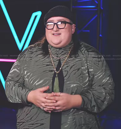 on The Voice on NBC was spotted wearing this green animal print shirt on The Voice on Apr 21 2023's episode. 's Top is the Long Sleeve Zebra Shirt in green by River Island.