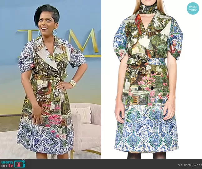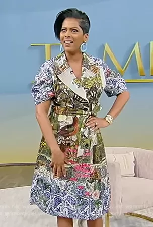 Tamron Hall on Tamron Hall Show on ABC was spotted wearing this printed wrap dress on Tamron Hall Show on Apr 21 2023's episode. Tamron's Dress is the Ottoman Empire Birds Half Sleeve Topper Coat by I Love Libertine.