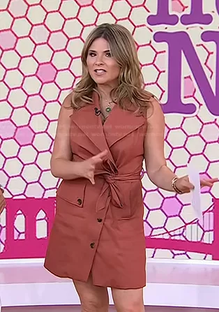 Jenna Bush Hager on Today on NBC was spotted wearing this brown sleeveless trench dress on Today on Apr 21 2023's episode. Jenna's Dress is the Trench Wrap Dress by Toccin.