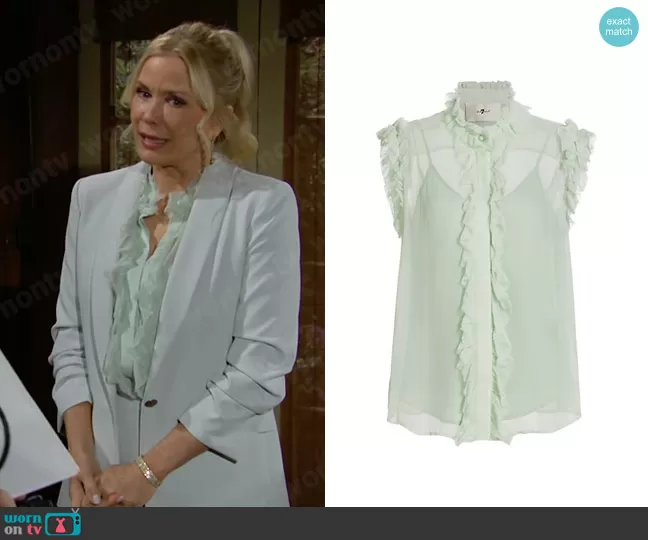 Brooke Logan (played by Katherine Kelly Lang) on The Bold and the Beautiful on CBS was spotted wearing this mint green ruffled top and blazer on The Bold and the Beautiful on Apr 21 2023's episode. Brooke's Top is the Ruffled Cotton Sleeveless Blouse in Seafoam by 7 For All Mankind . Brooke's Jacket is the Sebastian Blazer by Alice + Olivia.