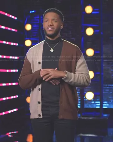 on The Voice on NBC was spotted wearing this brown colorblock cardigan on The Voice on Apr 21 2023's episode. 's Sweater is the Viscose Cozy Colorblock Cardigan by Fashion Nova Men.