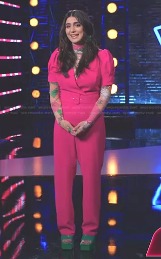 on The Voice on NBC was spotted wearing this pink belted jumpsuit on The Voice on Apr 21 2023's episode. 's Jumpsuit is the Kori Crepe Belted Jumpsuit by Adelyn Rae.