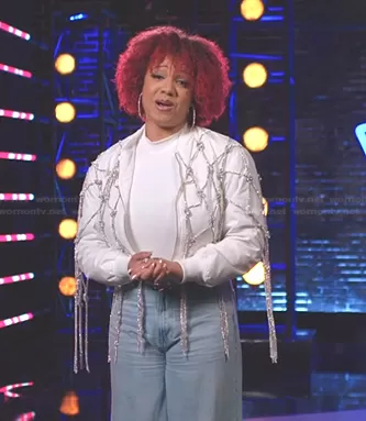 on The Voice on NBC was spotted wearing this white embellished knoted fringe jacket on The Voice on Apr 21 2023's episode. 's Jacket is the Knot Again Crop Bomber with Diamond Rope by Akira.