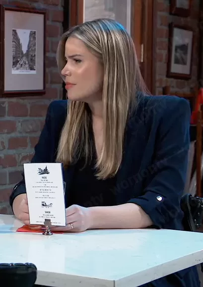 Sasha Gilmore (played by Sofia Mattsson) on General Hospital on ABC was spotted wearing this navy blazer on General Hospital on Apr 23 2023's episode. Sasha's Jacket is the Blazer with Rolled Up Sleeves by Zara .