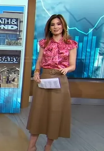 Rebecca Jarvis on Good Morning America on ABC was spotted wearing this pink printed top and beige leather skirt on Good Morning America on Aug 18 2023's episode. Rebecca's Top is the Brentley Flutter Sleeve Top by Alice + Olivia . Rebecca's Skirt is the Cape Skirt with Belt by Zara.