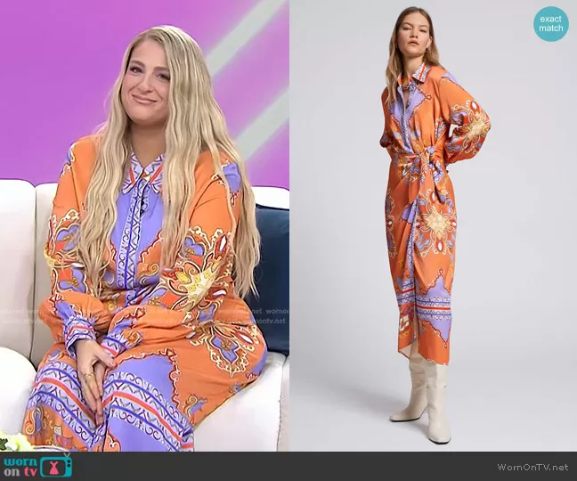 on Today on NBC was spotted wearing this orange and purple printed dress on Today on Apr 24 2023's episode. 's Dress is the Faux Wrap Midi Shirt Dress by & Other Stories.