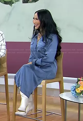 on Today on NBC was spotted wearing this blue satin dress on Today on Apr 24 2023's episode. 's Dress is the Alexis Dress by Equipment.
