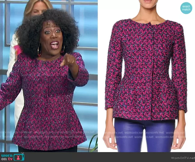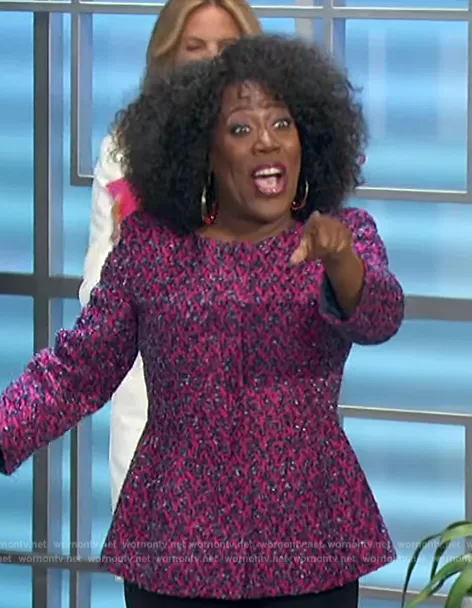 Sheryl Underwood on The Talk on CBS was spotted wearing this pink jacquard peplum top on The Talk on Apr 24 2023's episode. Sheryl's Top is the Boucle Peplum Jacket with 3/4 Sleeves by Giorgio Armani.