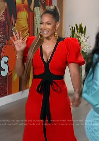 on The Talk on CBS was spotted wearing this red contrast tie waist dress on The Talk on Apr 24 2023's episode. 's Dress is the Luz wool crêpe midi dress by Gabriela Hearst.