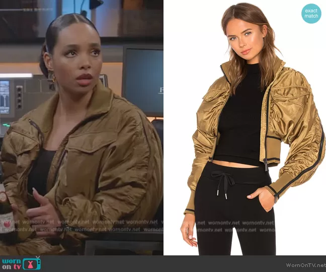 Skye (played by Madison Shamoun) on All American on CWTV was spotted wearing this gold satin cropped jacket and pants on All American on episode 'Mask Off' (5x17) in Apr 2023. Skye's Jacket is the Military Flight Corset Bomber Jacket by Ivy Park . Skye's Pants is the Military Pants by Ivy Park.