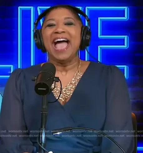 Deja Vu on Live with Kelly and Mark on Disney ABC Home Entertainment was spotted wearing this navy sheer wrap dress on Live with Kelly and Mark on Apr 25 2023's episode. Deja Vu's Dress is the Belted Puff Sleeve Dress by DKNY.