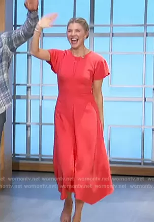 Amanda Kloots on The Talk on CBS was spotted wearing this coral midi dress on The Talk on Apr 25 2023's episode. Amanda's Dress is the Eleni Flutter-Sleeve Midi-Dress by Reiss.