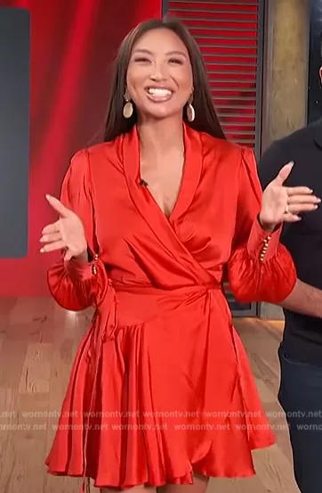 on Access Hollywood on NBC was spotted wearing this red satin wrap mini dress on Access Hollywood on Apr 25 2023's episode. 's Dress is the Ruffled silk-satin mini wrap dress by Zimmermann.