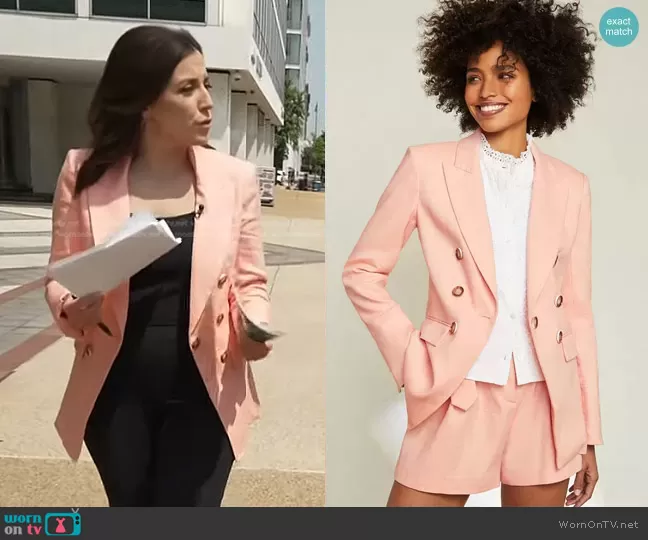 Hallie Jackson on Today on NBC was spotted wearing this pink double breasted blazer on Today on May 23 2023's episode. Hallie's Jacket is the Gaya Dickey Jacket by Veronica Beard.