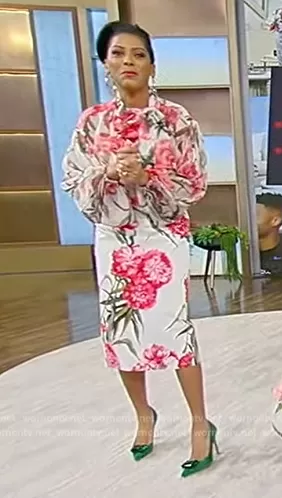 Tamron Hall on Tamron Hall Show on ABC was spotted wearing this white floral print blouse and skirt on Tamron Hall Show on Apr 26 2023's episode. Tamron's Top is the Floral-Print Neck-Tie Silk Chiffon Shirt by Dolce and Gabbana . Tamron's Skirt is the Floral-print pencil skirt by Dolce and Gabbana . Tamron's Shoes is the Jaipur maxi-gemstone pumps by Gianvito Rossi.