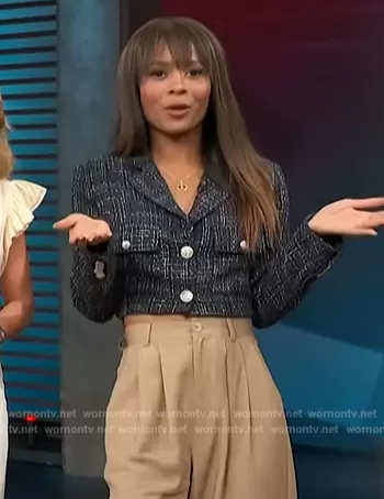 Zuri Hall on Access Hollywood on NBC was spotted wearing this black tweed cropped jacket on Access Hollywood on Apr 26 2023's episode. Zuri's Jacket is the Tweed Cropped Blazer by Aqua.