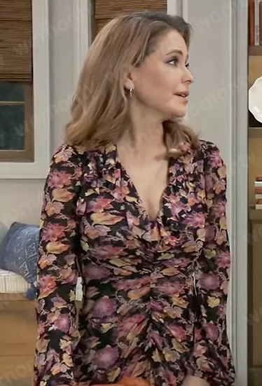 Olivia Falconeri (played by Lisa Lo Cicero) on General Hospital on ABC was spotted wearing this floral ruched front dress on General Hospital on Apr 27 2023's episode. Olivia's Dress is the Floral-print ruched dress by Diane von Furstenberg .