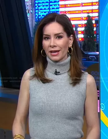 Rebecca Jarvis on Good Morning America on ABC was spotted wearing this grey sleeveless turtleneck sweater on Good Morning America on Apr 27 2023's episode. Rebecca's Sweater is the Cashmere Sleeveless Turtleneck Sweater by Michael Kors.