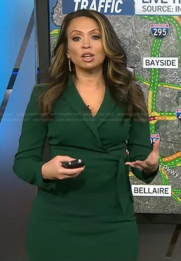 Adelle Caballero on Today on NBC was spotted wearing this green faux wrap dress on Today on Apr 27 2023's episode. Adelle's Dress is the Faux Wrap Tuxedo Dress by Badgley Mischka.