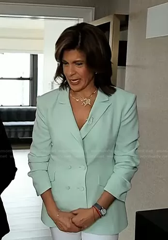 Hoda Kotb on Today on NBC was spotted wearing this Hoda’s mint green double breasted blazer on Today on Aug 24 2023's episode. Hoda's Jacket is the Kris Ruched Sleeve Double Breasted Blazer in Celadon by Cinq a Sept.