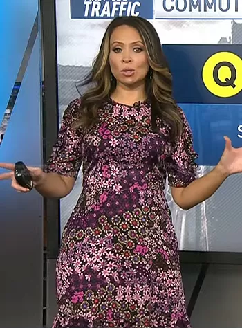 Adelle Caballero on Today on NBC was spotted wearing this purple floral dress on Today on Apr 28 2023's episode. Adelle's Dress is the Pacific Petals Smocked Dress by Kate Spade.