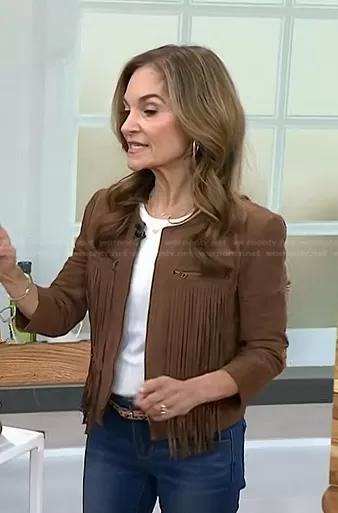 Joy Bauer on Today on NBC was spotted wearing this brown suede fringed jacket on Today on Apr 28 2023's episode. Joy's Jacket is the Faux Suede Fringe Jacket by Bcbgmaxazria.