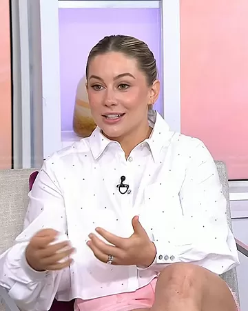 on Today on NBC was spotted wearing this white cropped shirt on Today on Apr 28 2023's episode. 's Top is the Selina Rhinestone Crop Shirt by Cinq a Sept.