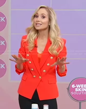on Good Morning America on ABC was spotted wearing this orange blazer with gold buttons on Good Morning America on Apr 28 2023's episode. 's Jacket is the Delilah Crepe Blazer in Papaya by Generation Love.