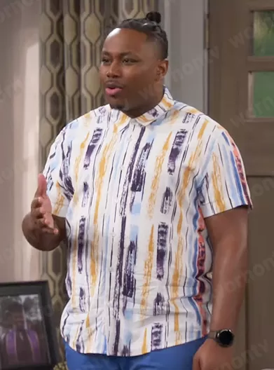 Marty (played by Marcel Spears) on The Neighborhood on CBS was spotted wearing this brushstroke print shirt on The Neighborhood on episode 'Welcome to the New Do' (5x19) in May 2023. Marty's Shirt is the Short sleeve shirt with stripe in white by River Island.