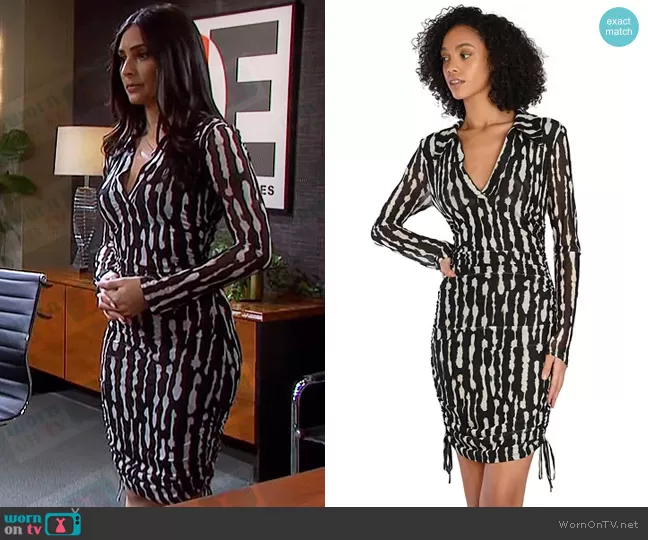 Gabi Hernandez (played by Camila Banus) on Days of our Lives on Peacock was spotted wearing this black and white tie dye dress on Days of our Lives on Apr 28 2023's episode. Gabi (old)'s Dress is the Nicole Williams English Printed Drawstring Dress by Bar III.