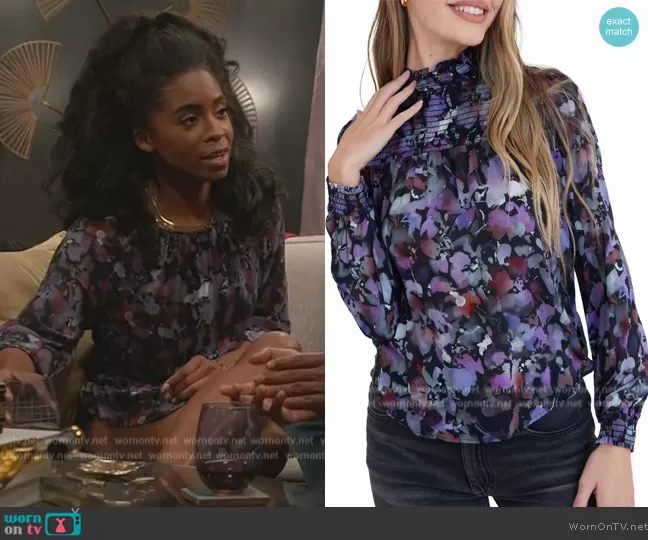 (played by ) on Grand Crew on NBC was spotted wearing this purple floral print blouse on Grand Crew on episode 'Wine & Journals' (2x09) in Apr 2023. 's Top is the Smocked Yoke Floral Long Sleeve Blouse by Bella Dahl.