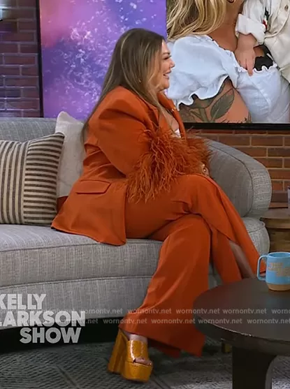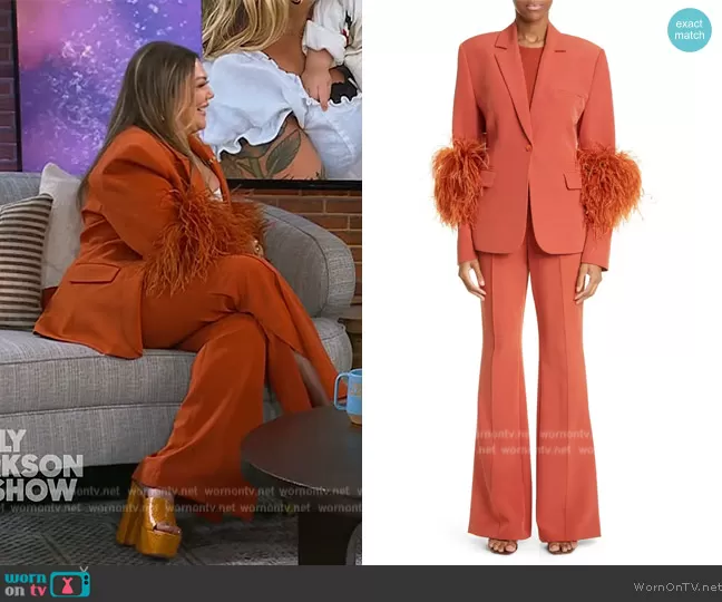 on The Kelly Clarkson Show on NBC was spotted wearing this feather trim blazer on The Kelly Clarkson Show on May 01 2023's episode. 's Blazer is the Ostrich Feather Trim Matte Crepe Blazer by Lapointe . 's Pants is the Matte Crepe Flare Leg Pants by Lapointe.