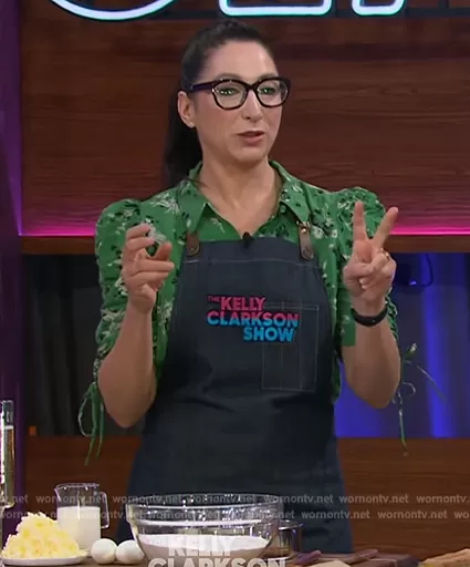 on The Kelly Clarkson Show on NBC was spotted wearing this green floral print top on The Kelly Clarkson Show on May 01 2023's episode. 's Top is the Carmine Ruched Sleeve Blouse by Veronica Beard.