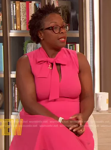 on The Drew Barrymore Show on CBS was spotted wearing this pink tie neck dress on The Drew Barrymore Show on May 01 2023's episode. 's Dress is the Carolina Dress by Black Halo.