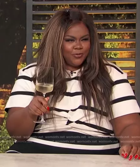 on Access Hollywood on NBC was spotted wearing this contrast striped dress on Access Hollywood on May 01 2023's episode. 's Dress is the Willow Striped Twisted-Front Midi Dress by Tanya Taylor.