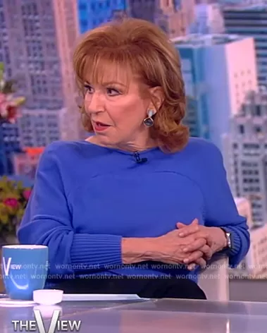 Joy Behar on The View on ABC was spotted wearing this blue sweater on The View on May 02 2023's episode. Joy's Sweater is the Dolman Sleeve Sweater by Lafayette 148 New York .