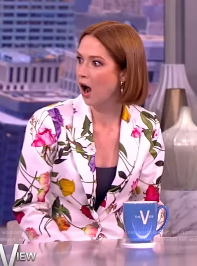 on The View on ABC was spotted wearing this white floral print blazer and pants on The View on May 02 2023's episode. 's Blazer is the Ziahh Floral Jacket by Ted Baker . 's Pants is the Ziaaht Floral Tapered Trousers by Ted Baker.