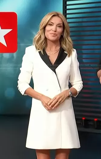 Kit Hoover on Access Hollywood on NBC was spotted wearing this white double breasted blazer dress on Access Hollywood on May 26 2023's episode. Kit's Dress is the Kyrie Tuxedo Dress by Alice + Olivia.