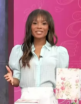 Zuri Hall on Access Hollywood on NBC was spotted wearing this blue houndstooth puff sleeve top on Access Hollywood on May 03 2023's episode. Zuri's Top is the Willa Puff Sleeve Silk Button-Up Shirt by Alice + Olivia.
