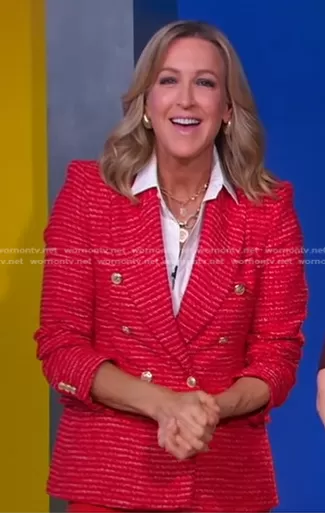 Lara Spencer on Good Morning America on ABC was spotted wearing this red tweed blazer on Good Morning America on Apr 10 2024's episode. Lara's Jacket is the Textured Double Breasted Blazer by Zara.