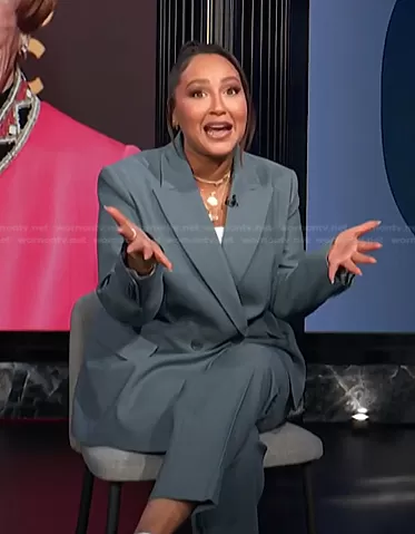 Adrienne Houghton on E! News on E! was spotted wearing this blue double breasted blazer and pants on E! News on Apr 26 2023's episode. Adrienne's Jacket is the Double-Breasted Blazer by Maje . Adrienne's Pants is the Pleated Straight-Fit Trousers by Maje.