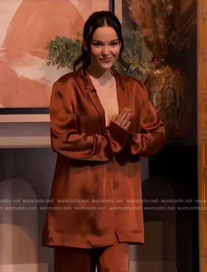 on The Drew Barrymore Show on CBS was spotted wearing this brown satin blazer and pants on The Drew Barrymore Show on May 03 2023's episode. 's Top is the Tilbury Silk Shirt by Hansen + Gretel . 's Pants is the Nash Silk Pant by Hansen + Gretel.