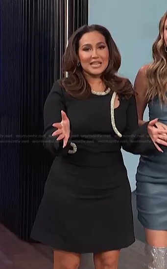 Adrienne Houghton on E! News on E! was spotted wearing this black embellished cutout dress on E! News on Apr 27 2023's episode. Adrienne's Dress is the Katharine Diamante Embroidery Cutout Mini Dress by Simkhai.