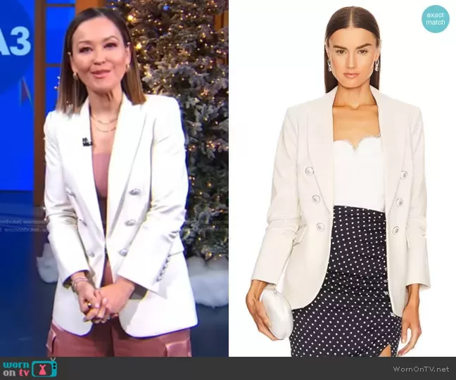 Eva Pilgrim on Good Morning America on ABC was spotted wearing this white blazer and pink satin pants on Good Morning America on Mar 07 2025's episode. Eva's Jacket is the Beacon Dickey Jacket in Ecru by Veronica Beard . Eva's Pants is the Hayes High-Waist Wide-Leg Cargo Pants by Alice + Olivia.