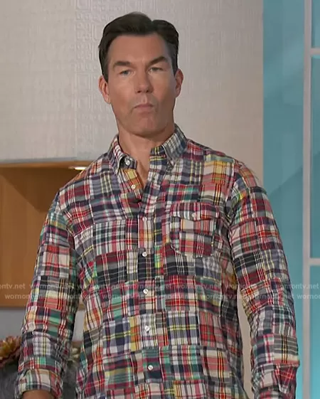Jerry O'Connell on The Talk on CBS was spotted wearing this multicolored plaid shirt on The Talk on May 04 2023's episode. Jerry's Shirt is the Patchwork button-down shirt by Ralph Lauren.