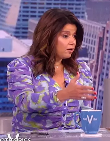 Ana Navarro on The View on ABC was spotted wearing this blue floral ruched top on The View on May 05 2023's episode. Ana's Top is the Gladys Reversible Top by Diane von Furstenberg.